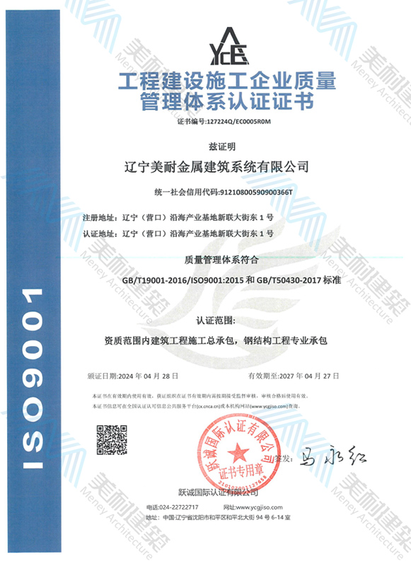 遼寧美耐金屬建筑系統(tǒng)有限公司位于遼寧(營口)沿海產(chǎn)業(yè)基地,專注于預(yù)制金屬建筑系統(tǒng)領(lǐng)域,是一家集工業(yè)建筑設(shè)計、制作、施工及相關(guān)的技術(shù)咨詢與服務(wù)為一體的綜合性服務(wù)企業(yè)。作為國家鋼結(jié)構(gòu)協(xié)會會員、中國建筑金屬結(jié)構(gòu)協(xié)會會員單位與國家高新技術(shù)企業(yè),美耐建筑集建筑工程施工總承包、鋼結(jié)構(gòu)工程專業(yè)承包等多種資質(zhì)于一身,并擁有22項(xiàng)鋼結(jié)構(gòu)建筑領(lǐng)域?qū)@?項(xiàng)軟件著作權(quán)。